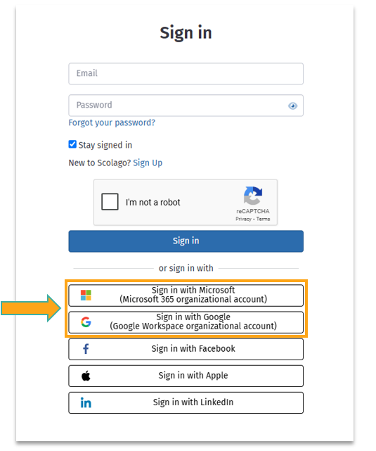 Access the Scolago login page and click on the necessary secure connection (in case your organization has already created your account), or select the one of your choice