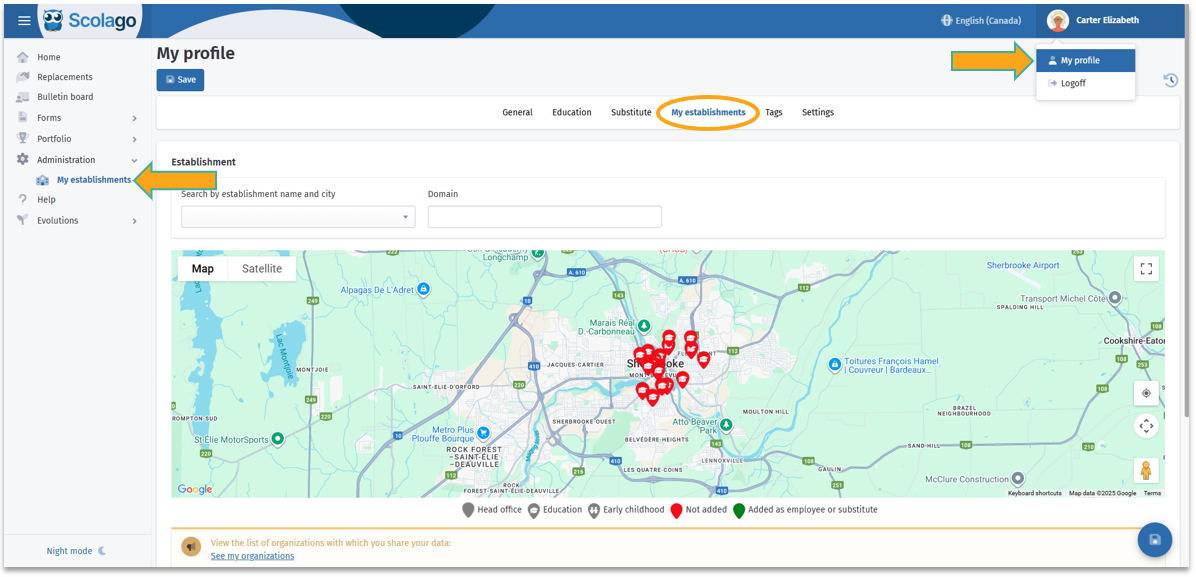 If you want to add one or more establishments to your profile, you must first access the My establishments module, which can be found in the dropdown menu under the Administration module or under the My establishments tab in My profile.