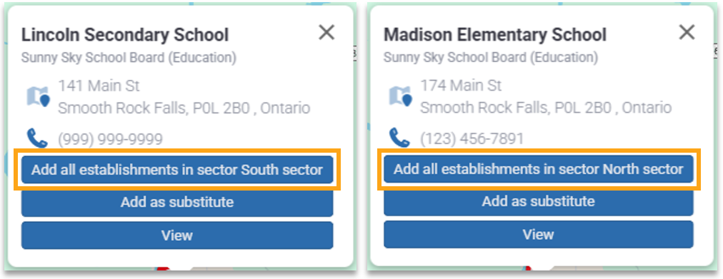 Indeed, an organization's establishments can be divided into sectors. This allows you to add all nearby establishments, regardless of which establishment you are searching from. To do this, find an establishment you wish to add and click on the Add all establishments in the sector button.