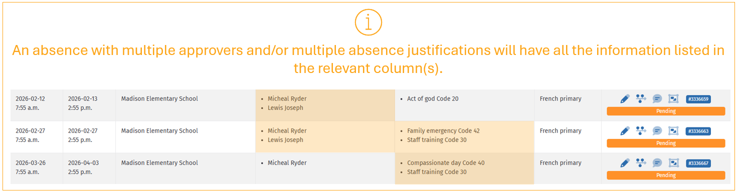 The table displays the key details for each of your absence requests, specifically: