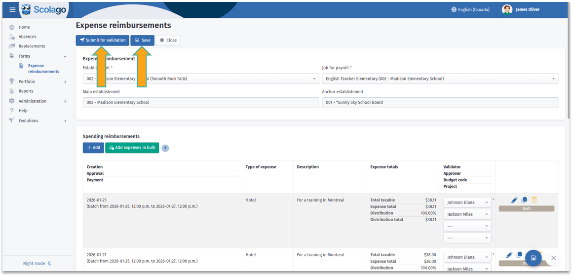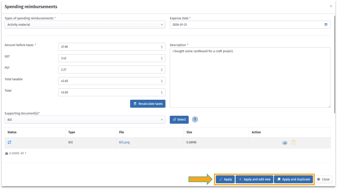 - Apply and duplicate: Ideal if you have several similar expenses to submit. However, you must check and adjust the information of the duplicated expense as needed before submitting it.