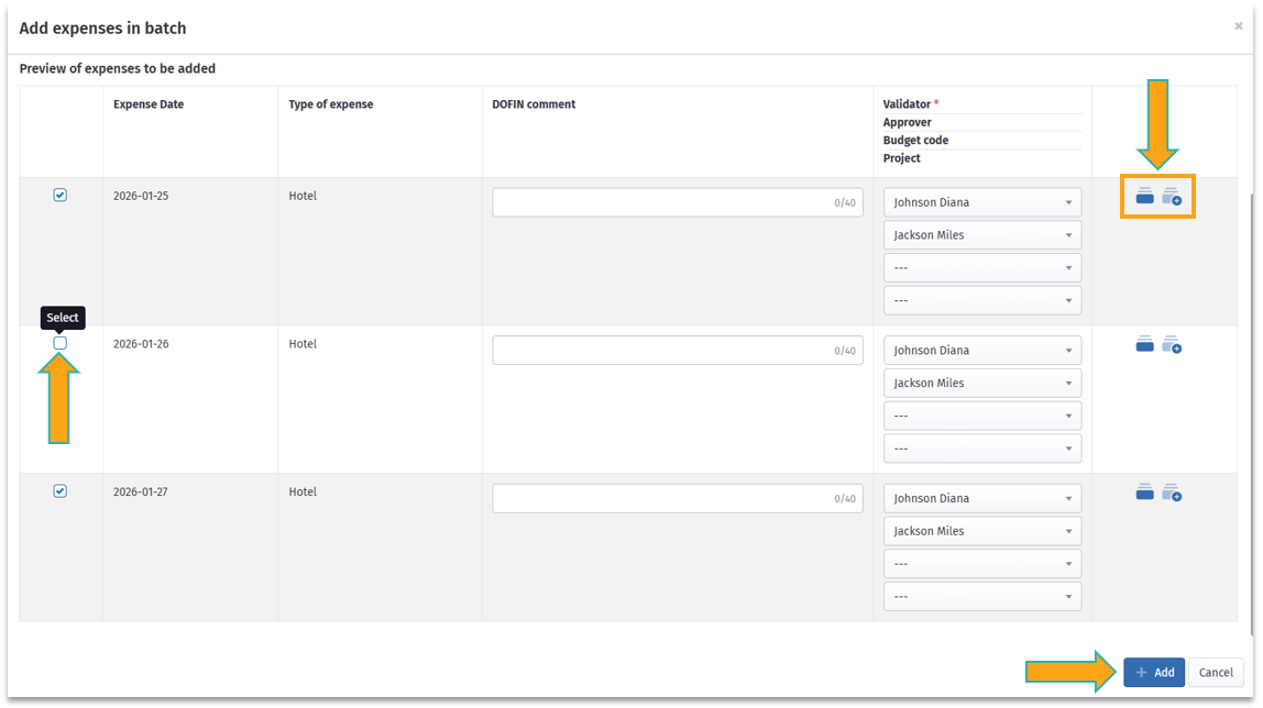 Then, you must fill in the Validator field. If possible, complete the other fields: DOFIN comment, Approver, Budget code, and Project. All data entered in one row can be copied to the other rows to facilitate your data entry. To do this, use those icons: