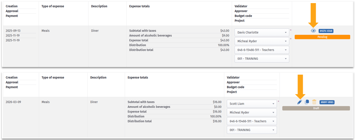 Then, open the relevant expense using the pencil icon or the eye icon, depending on its status.