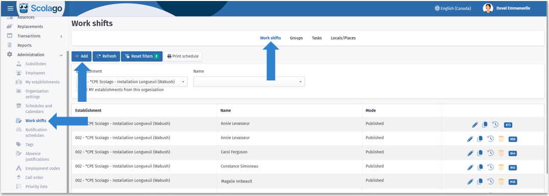 From the Administration menu, access the Work Shifts module, in the Work Shifts tab, and click the Add button.