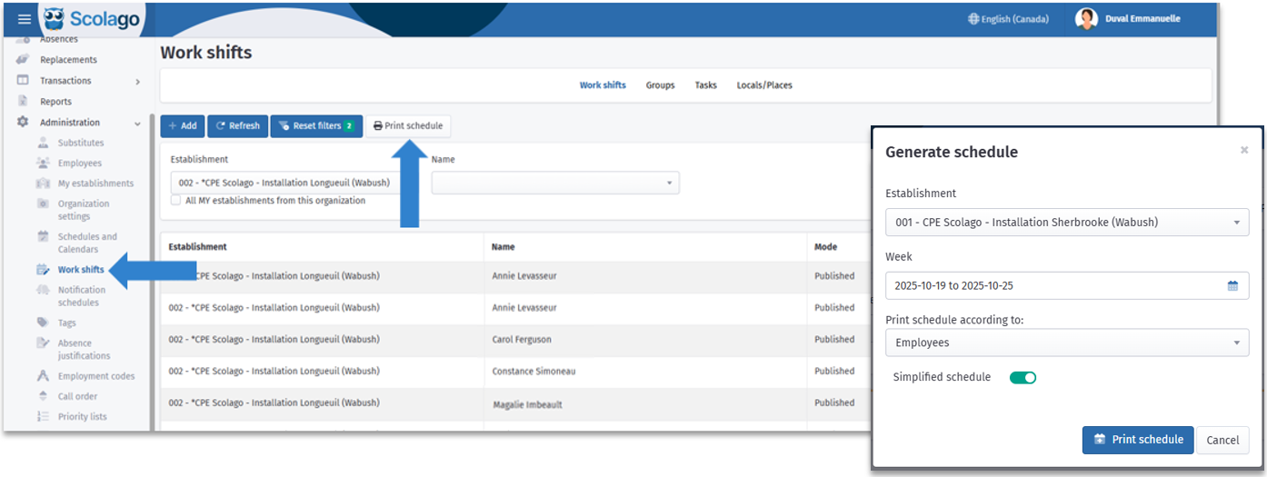If you'd like, you can print the schedule. Find the Print schedule button in the Works shifts module. On the page that opens, select your desired dates and display options.