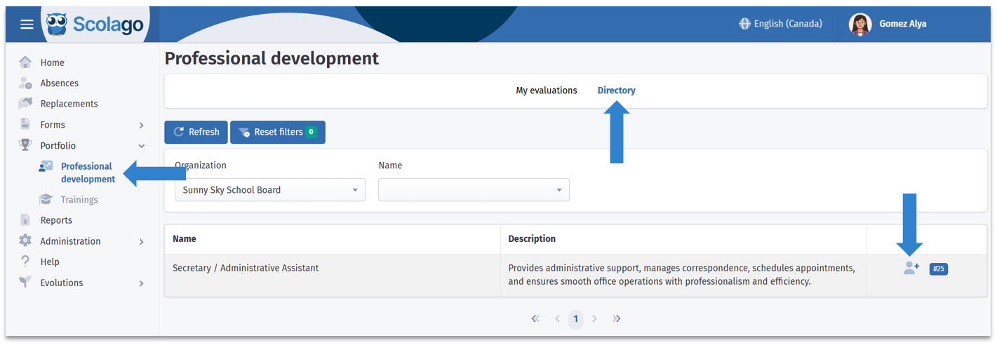 Go to the Professional development module under the Portfolio tab in the left-hand menu. Then, click on the Directory tab.