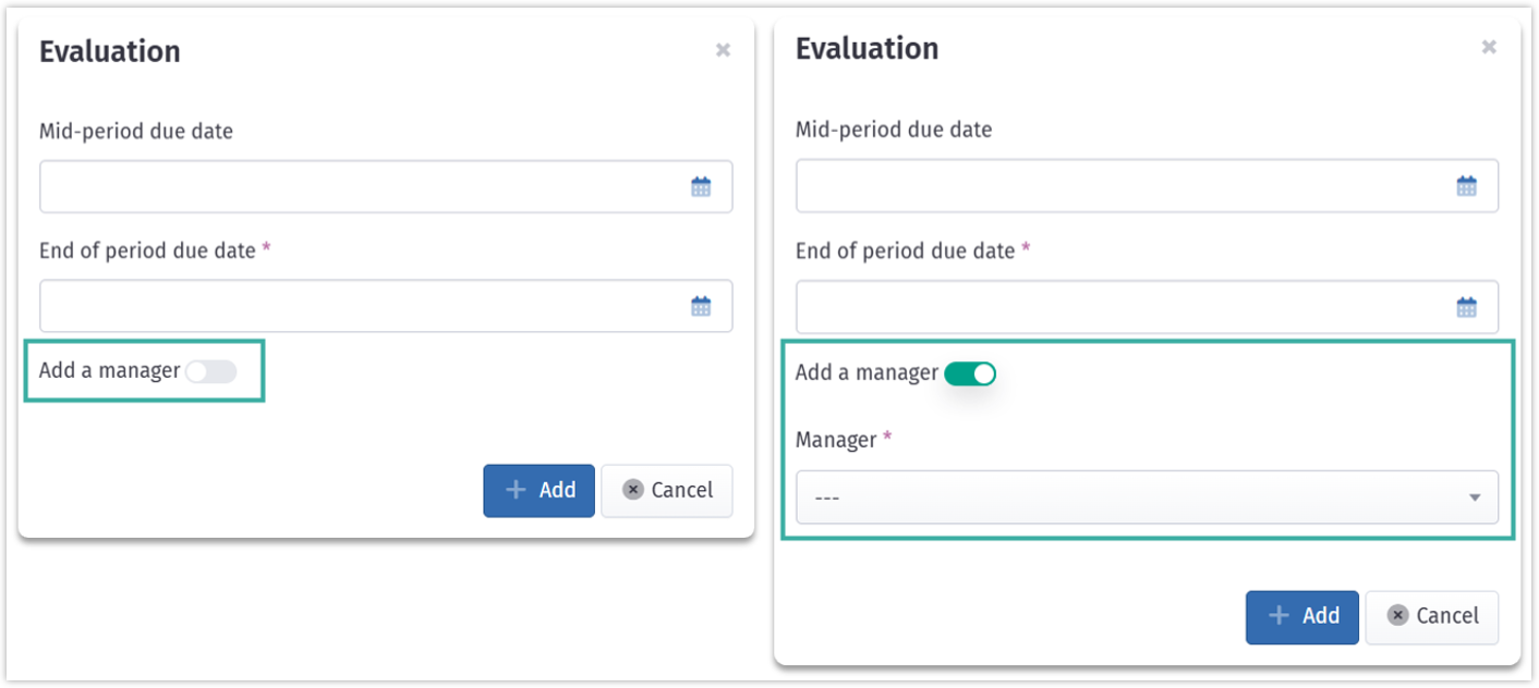 If you want this professional evaluation to be managed personally, leave the Add a manager switch inactive. Otherwise, activate it so the Manager field appears. Using the dropdown menu, select the manager who will be responsible for evaluating you according to the same criteria you use for your self-evaluation.