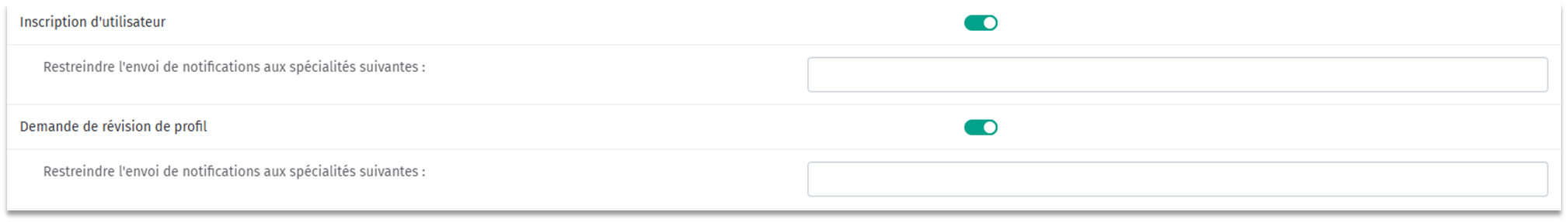 Pour ce qui est des administrateurs de la plateforme, deux notifications vous permet de choisir pour quelles spécialités vous souhaitez recevoir un courriel. Pour ce faire, sélectionnez les spécialités concernées dans le menu déroulant. N'oubliez pas d'activer la pastille respective et d'enregistrer.