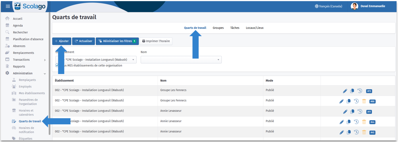 Depuis le menu Administration, accédez au module Quarts de travail, dans l’onglet Quarts de travail et cliquez sur le bouton Ajouter.