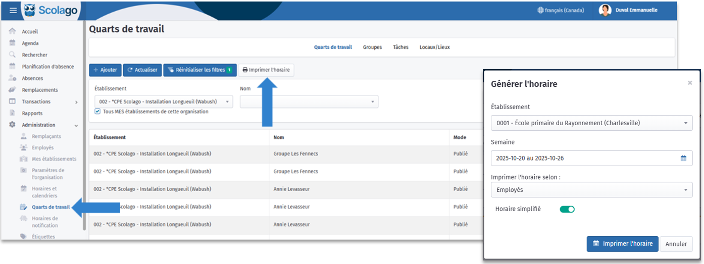 Si désiré, vous pouvez mettre l'horaire sur papier. Repérez le bouton Imprimer l'horaire au module Quarts de travail. Dans la page qui s'ouvre, sélectionnez les dates souhaitées et affichage voulus.