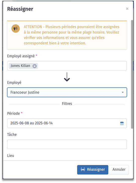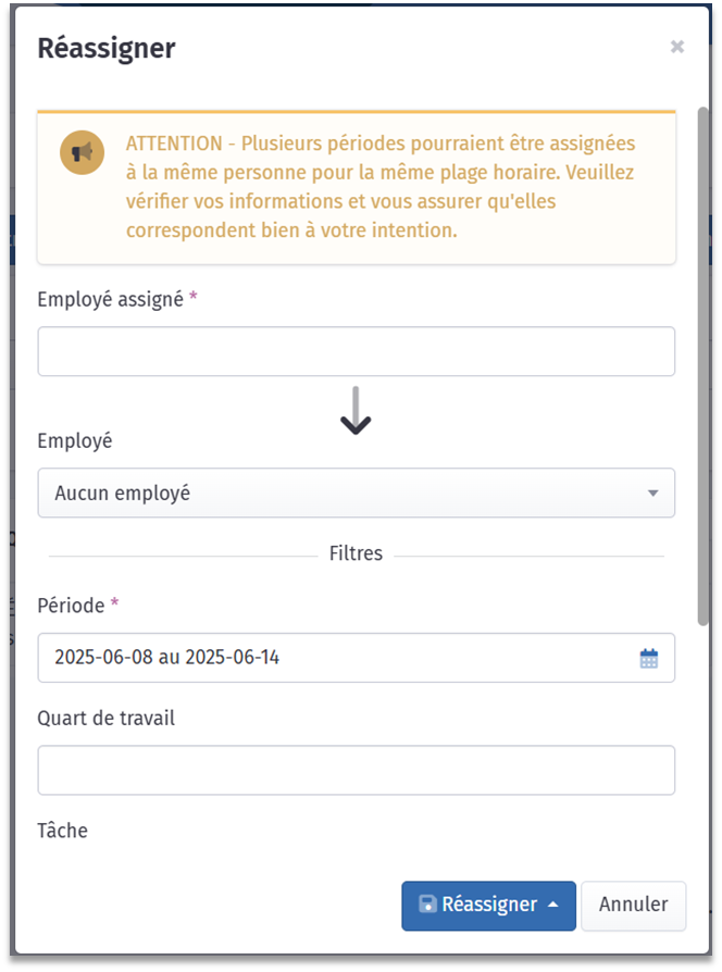 Attention, à l'aide des réassignation de masse, plusieurs périodes d'un ou de plusieurs employés pourraient être assignées à la même personne sur la même plage horaire, engeandrant des chevauchements. Veuillez vérifier vos informations et vous assurer qu'elles correspondent bien à votre intention.