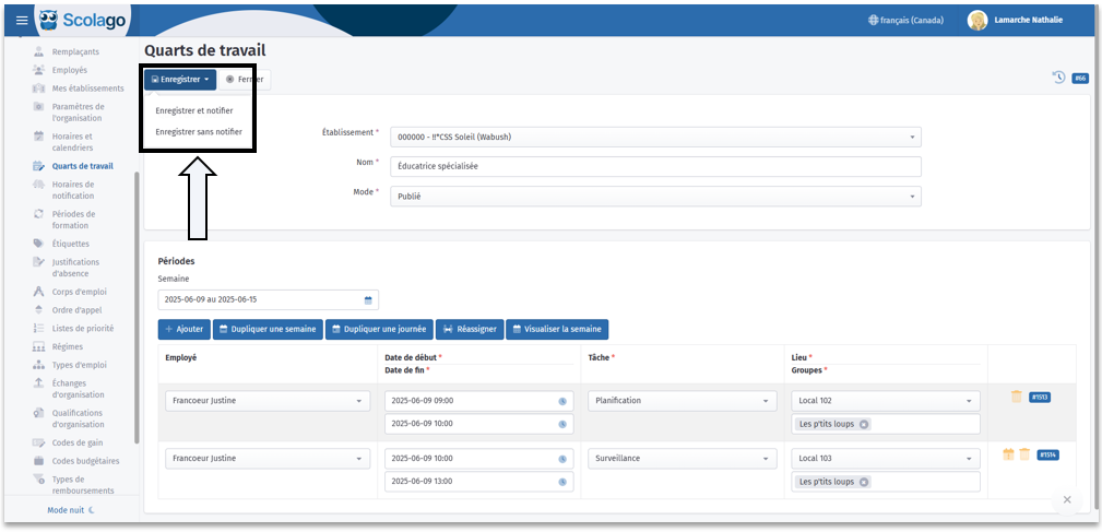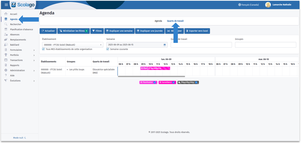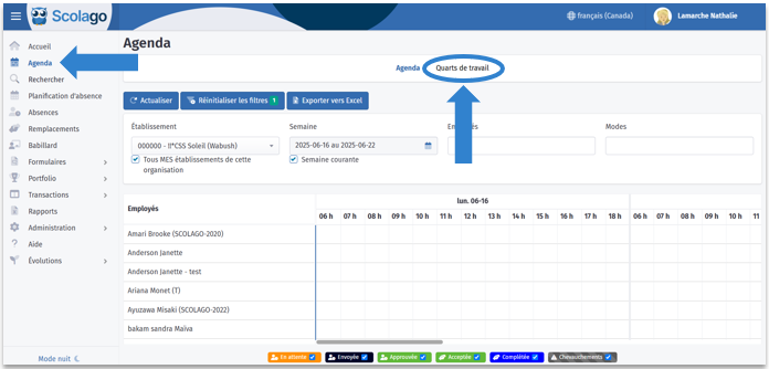 Accédez au module Agenda, puis cliquez sur l’onglet Quarts de travail.