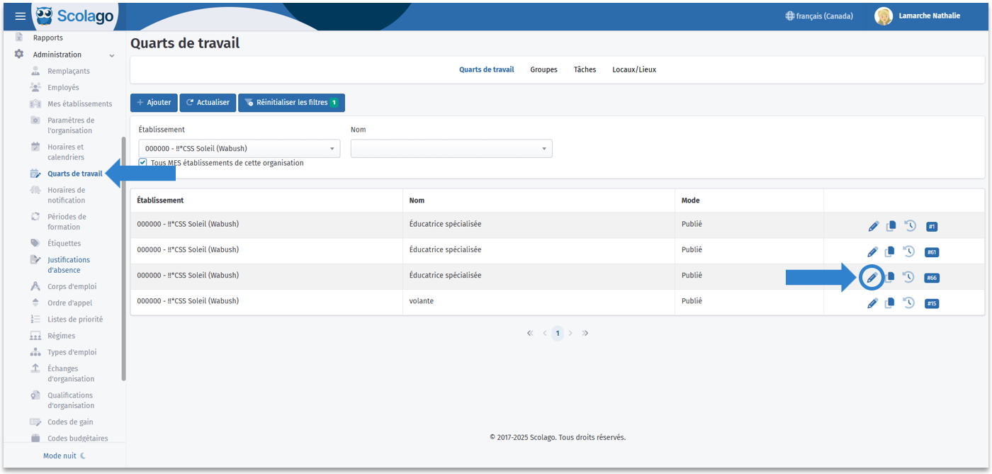 Accédez au module Quarts de travail. Ouvrez le quart à modifier en cliquant sur l’icône crayon à droite de la ligne correspondante.