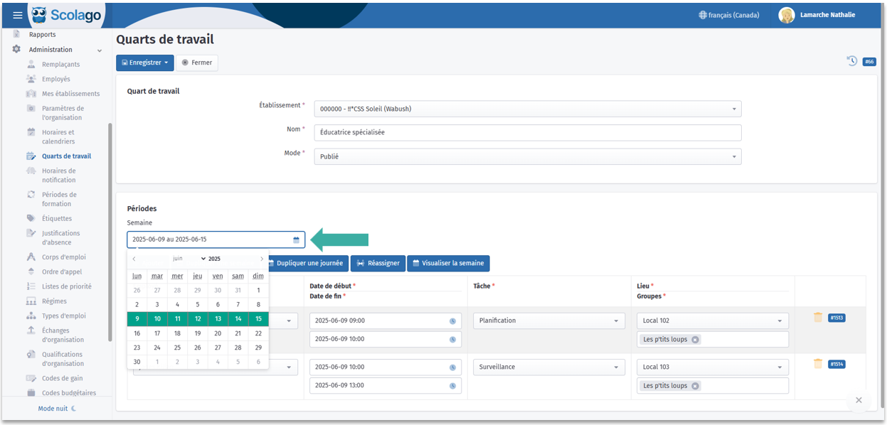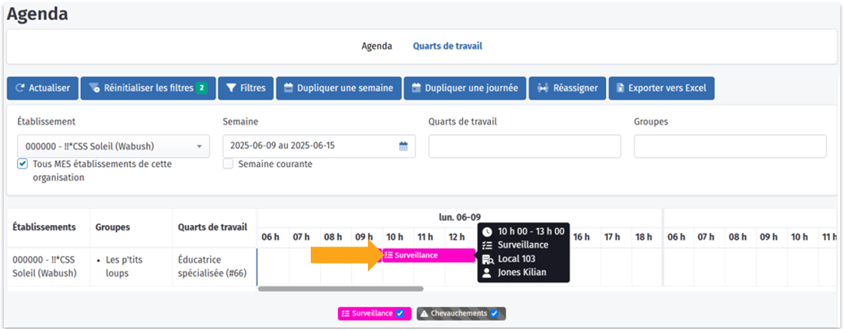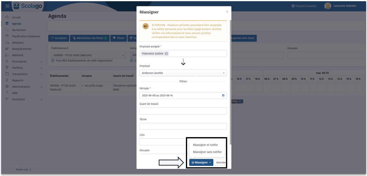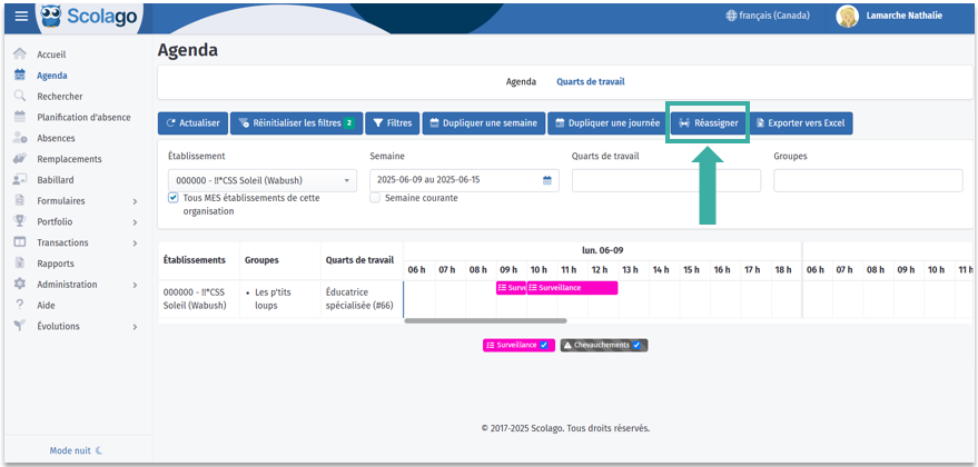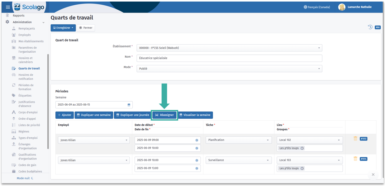 Si besoin, cliquez sur ce lien pour accédez à la vidéo de cette procédure : Vidéo : Comment réassigner un quart de travail dans les modules « Agenda » et « Quarts de travail »?.