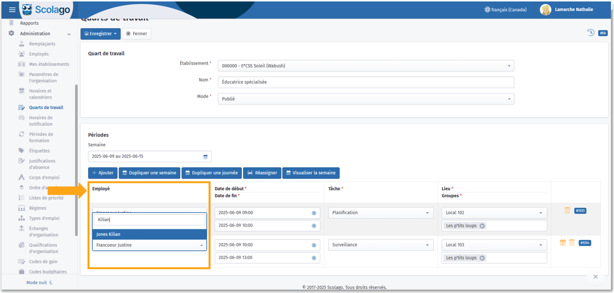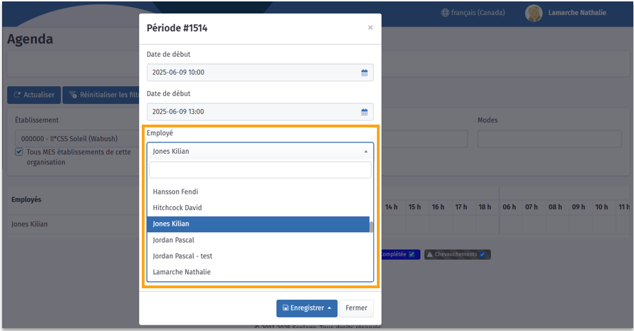 Modifiez l'employé sur la ou les périodes souhaitée(s).