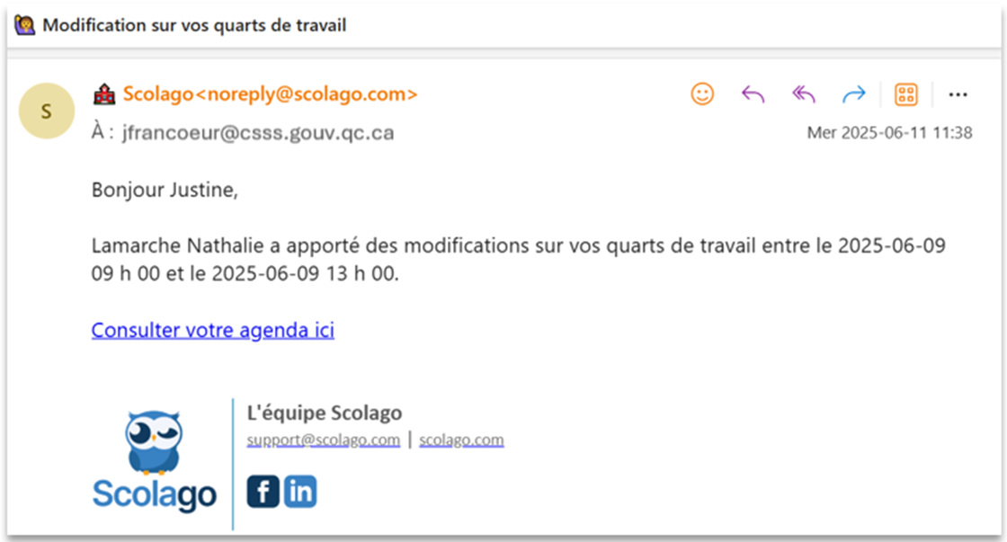Le nouveau quart assigné apparaîtra automatiquement dans le module Accueil de l’employé sélectionné. Il disparaîtra également du module Accueil de l'employé initialement assigné. Aucune action n’est requise de leur part.