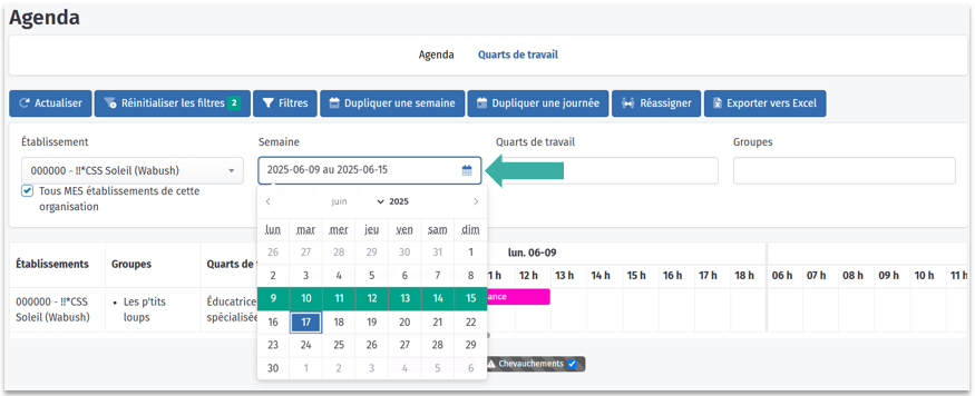 Par défaut, la semaine affichée sera celle courante. Au besoin, sélectionnez la semaine concernée.